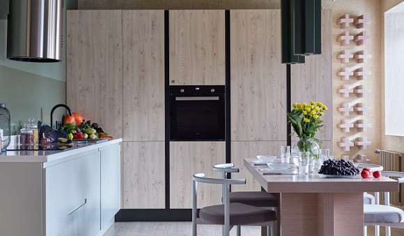 Сейчас в тренде серые кухни из натуральной древесины. При этом темные графитовые версии, могут дополняться вставками светлого цвета – бежевыми или белыми.