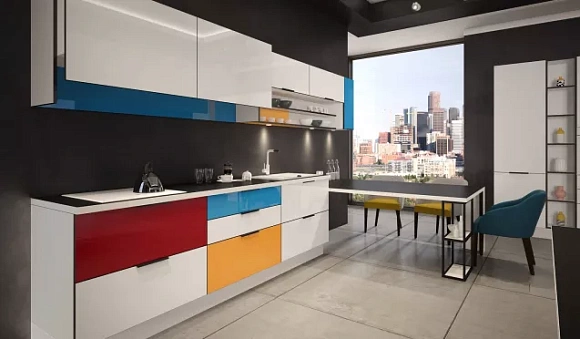 В просторных помещениях можно использовать сочетание черного с желтым. Такой дуэт выглядит очень смело и интересно. Конечно, темный оттенок в этом случае используется умеренно. Например, для оформления столешницы, цоколей, навесных полок.