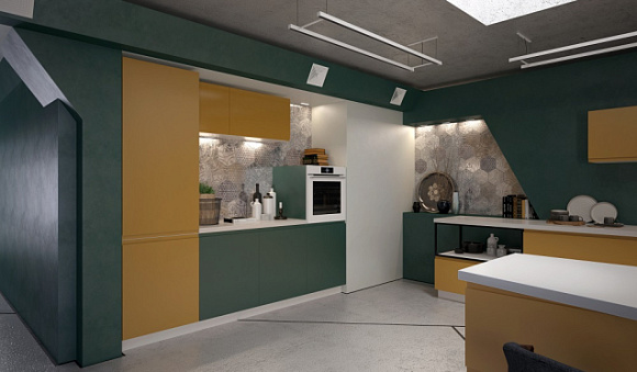 Шкафы с лимонными поверхностями на фоне оливковых стен.