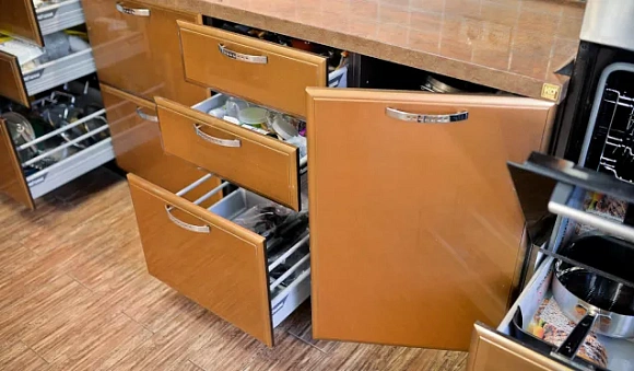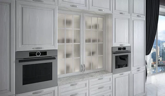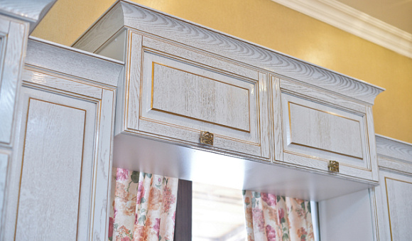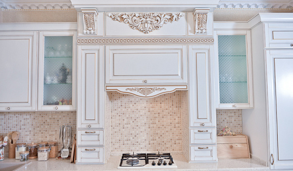 Нельзя дополнять комплекты такого типа элементами серебристого цвета. Например, мойка из нержавейки и хромированные детали будут смотреться с таким гарнитуром дисгармонично. Поэтому выбирайте кухни на заказ в тон или нейтрального цвета.