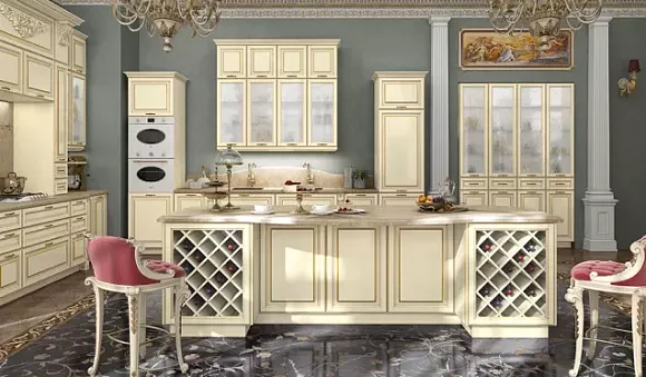 Для просторной квартиры-студии или загородного дома подходящим решением станет кухня в золотом цвете с островом. Такой комплект подходит для зонирования пространства, также островная конструкция используется в качестве дополнительной столешницы или вместо обеденного стола. В большой остров можно встроить мойку или варочную панель.