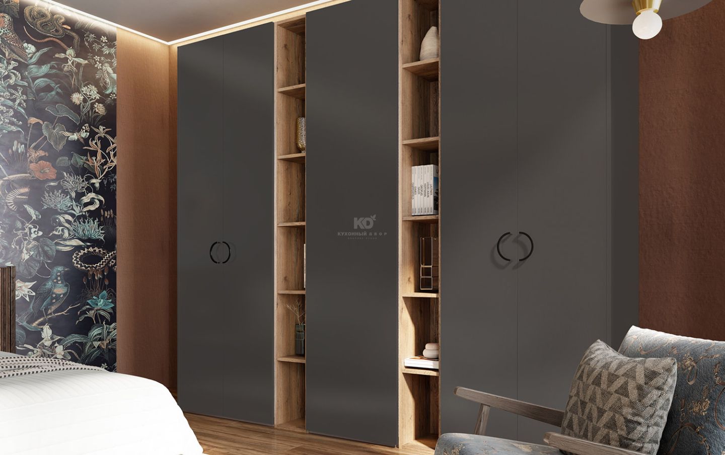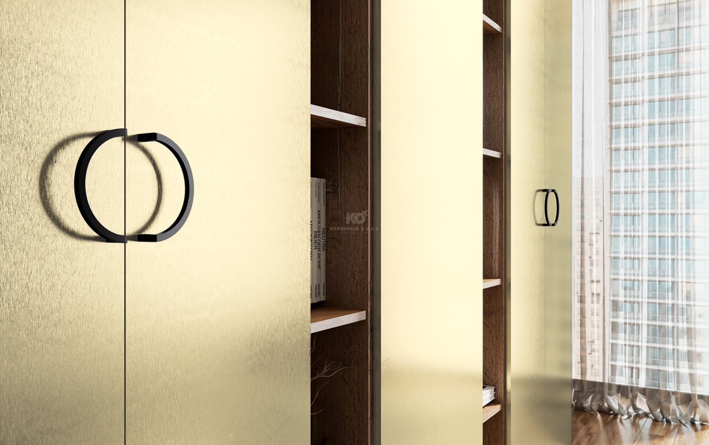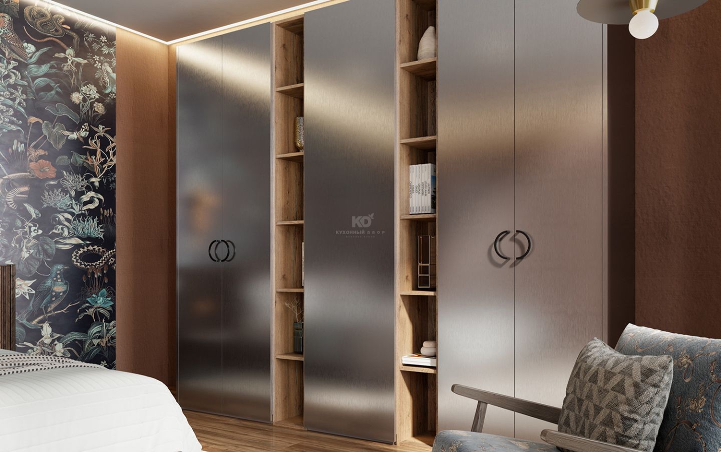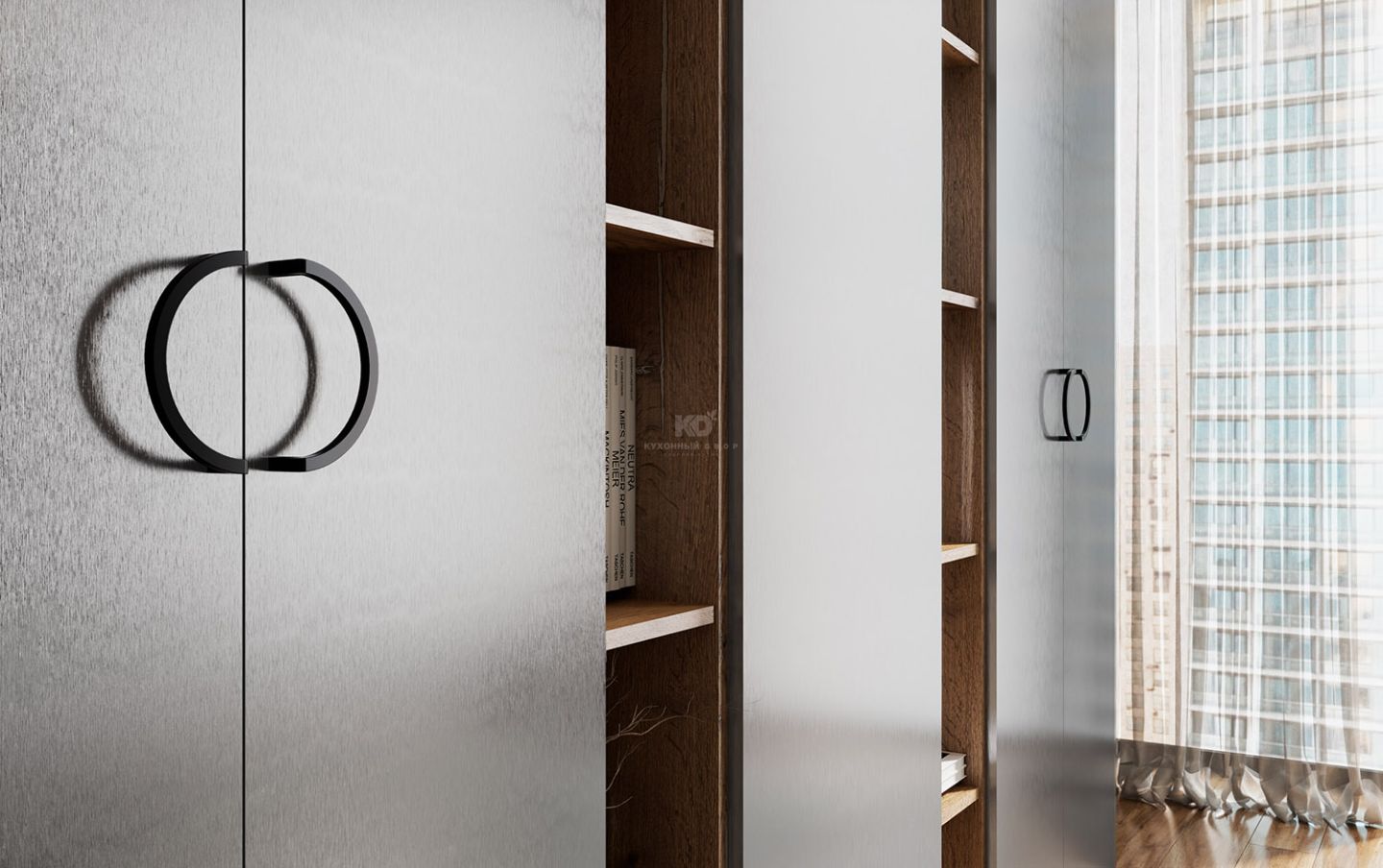 Фасады шкафа Мира — это торжество материала, который обманывает зрение. Глядя на них, вы видите холодное благородство металла, но стоит прикоснуться — и пальцы ощущают тепло и глубокую, почти природную мягкость:
