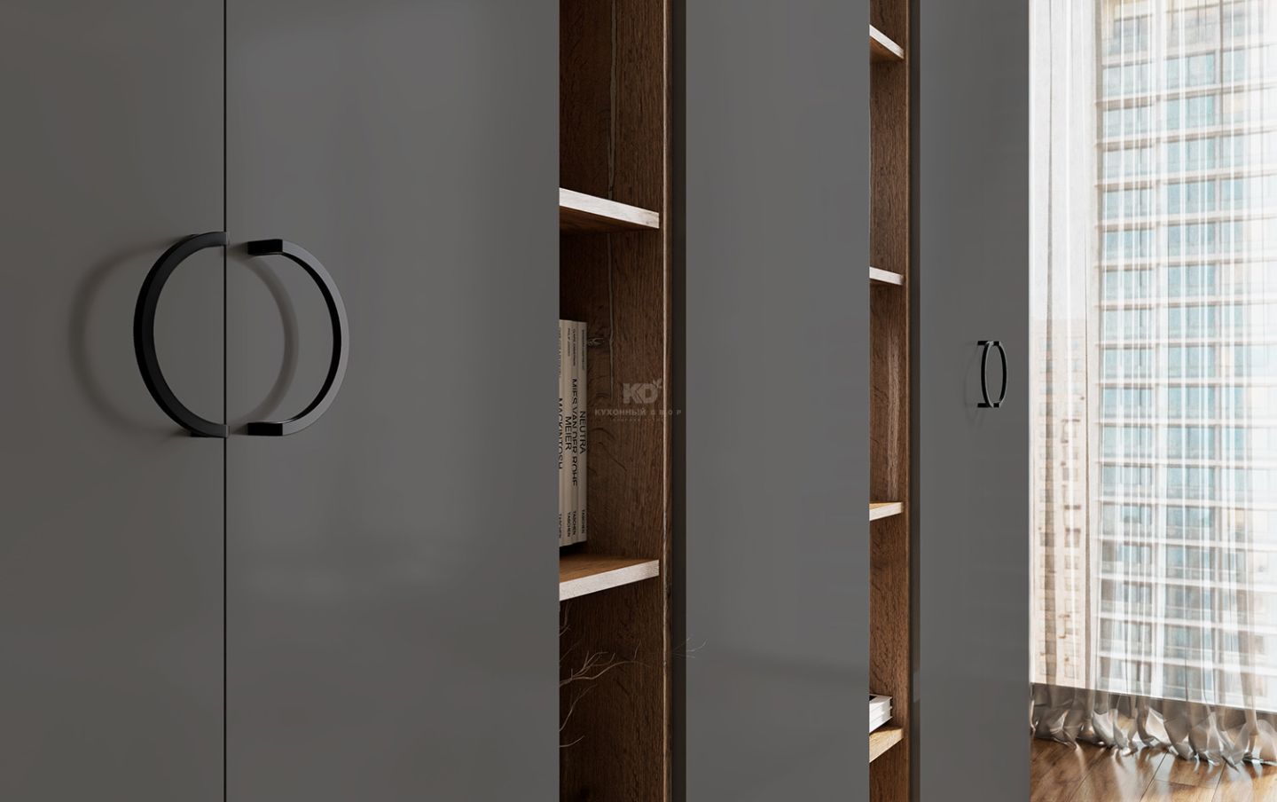 Открытые полки позволяют интегрировать в строгую систему хранения личные смыслы — книги, предметы искусства или памятные мелочи, которые делают пространство по-настоящему вашим.