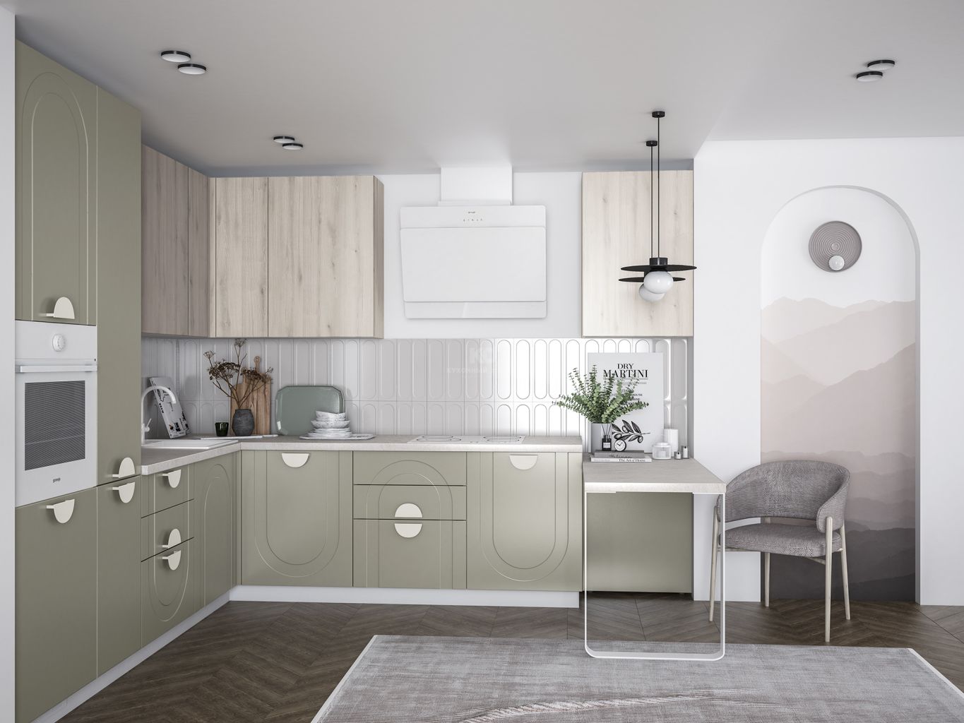 Форма кухни — угловая для максимально оптимального использования пространства. Пройдитесь по ней и почувствуйте продуманность каждой детали для реальной жизни, а не для красоты. Зоны подчиняются правилу «рабочего треугольника»: все на расстоянии вытянутой руки, при этом остается достаточно воздуха. Особое место занимает стол, примыкающий к стене. Он объединяет рабочую и обеденную зоны, превращая их в цельное пространство для готовки, завтраков утром и свиданий по вечерам.